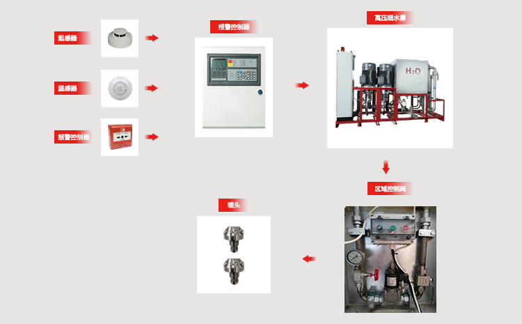 高壓細水霧滅火系統(tǒng)一般由感溫火災探測器、火災報警控制器、火災聲光報警器、高壓主泵、穩(wěn)定泵、區(qū)域閥箱組件、高壓細水霧噴頭等部件組成。